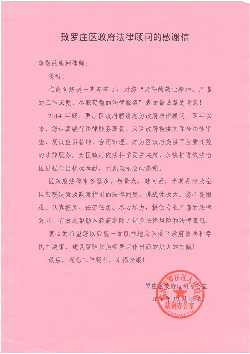 12月23日,临沂市罗庄区人民政府致信我所张彬律师,就其担任区政府法律顾问两年多来,认真履行政府法律顾问职责,提供优质高效法律服务,为区政府依法科学民主决策,有效的帮助区政府化解诸多法律风险,加快推进依法治区进程方面做出的贡献表示衷心感谢。